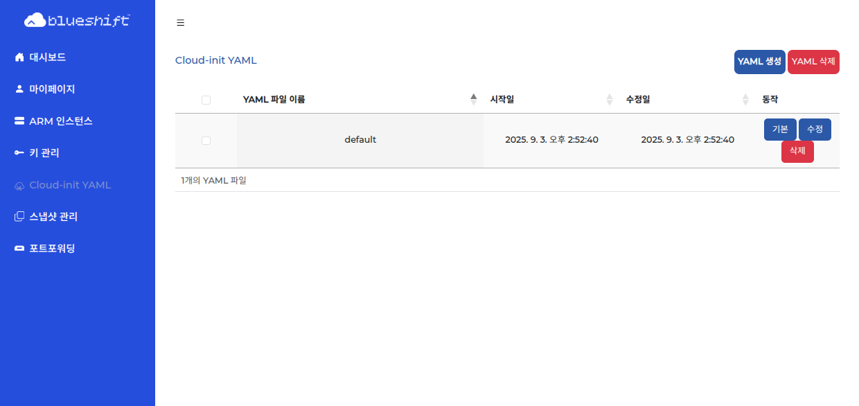 블루시프트 홈의 좌측 탭에서 ‘Cloud-init YAML’를 선택하고, 우측 상단의 YAML 생성 버튼을 클릭합니다.