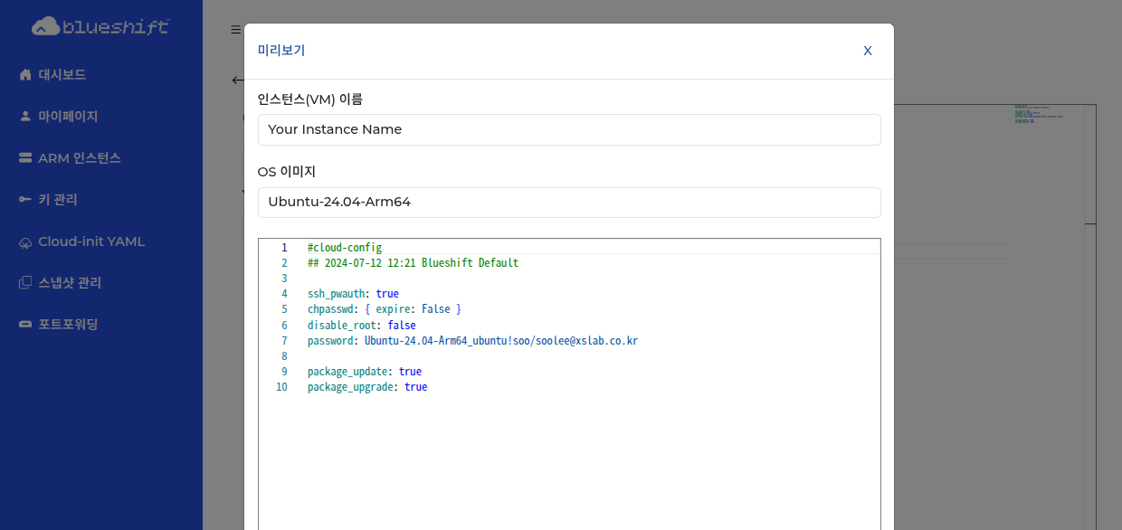 블루시프트는 기본적으로 인스턴스 최초 부팅 시 SSH 비밀번호 로그인 허용, 초기 비밀번호 만료 해제, root 계정 사용 허용, 초기 비밀번호 자동 생성,