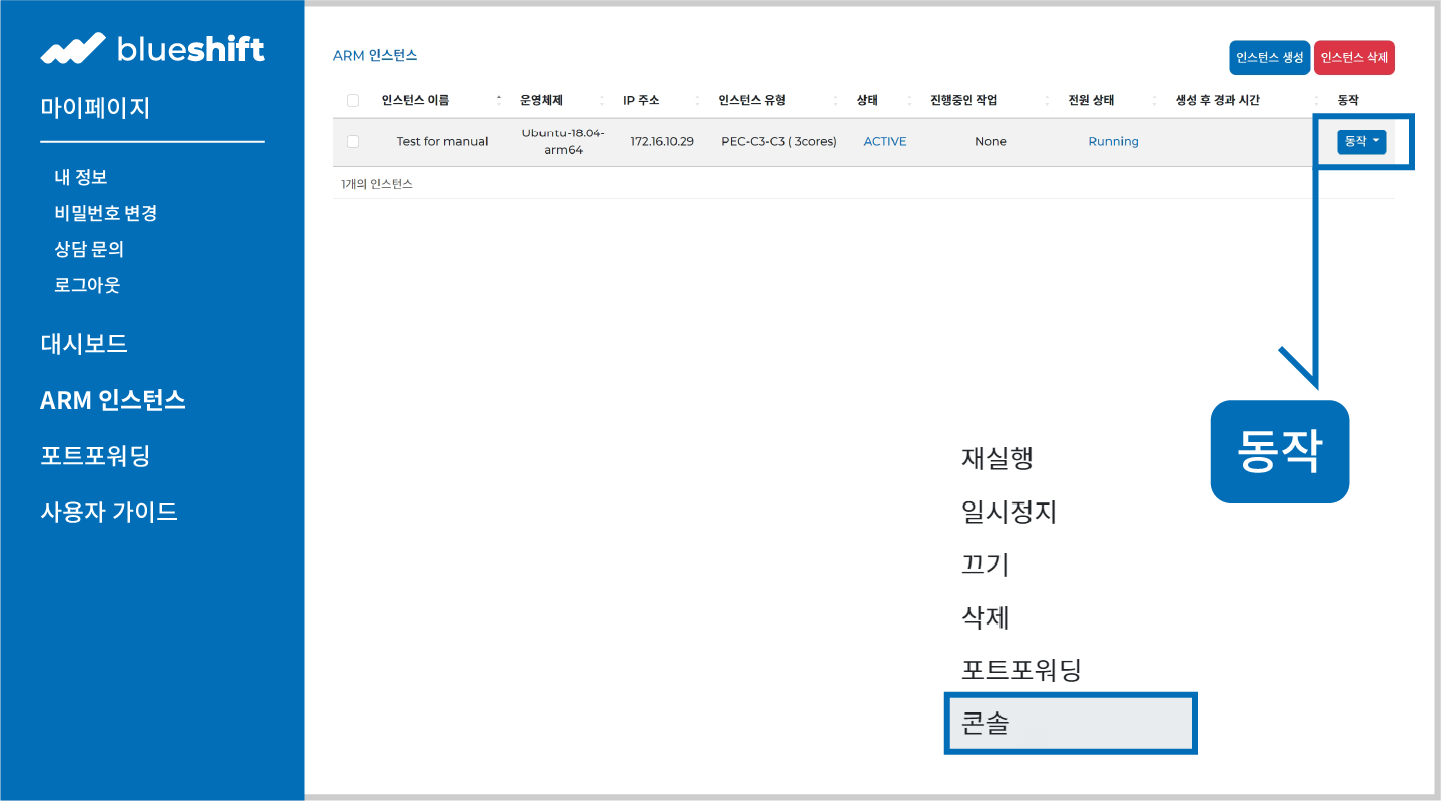 인스턴스 접속을 위해서는 먼저 인스턴스가 생성·가동(Active) 상태여야 합니다. 인스턴스 목록 테이블의 우측 ‘동작’ 버튼을 클릭한 뒤, 제공되는 메뉴에서