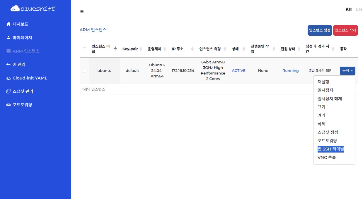 로그인 후 블루시프트 홈의 좌측 탭에서 ‘Arm 인스턴스’를 선택하고, 우측 상단의 인스턴스 생성 버튼을 클릭합니다.