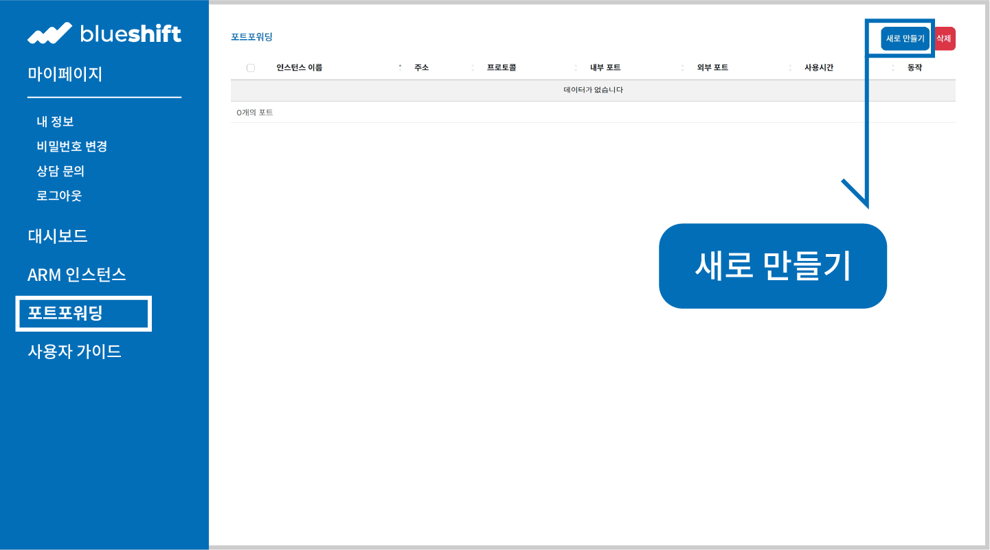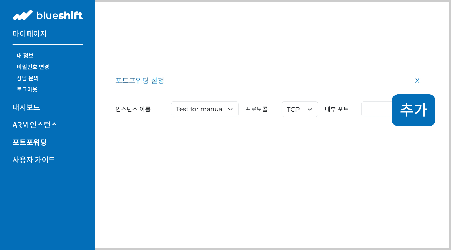 블루시프트의 Arm 인스턴스는 외부 포트포워딩을 지원합니다. 인스턴스가 존재하는 상태에서 블루시프트 홈의 좌측 탭에서 포트포워딩