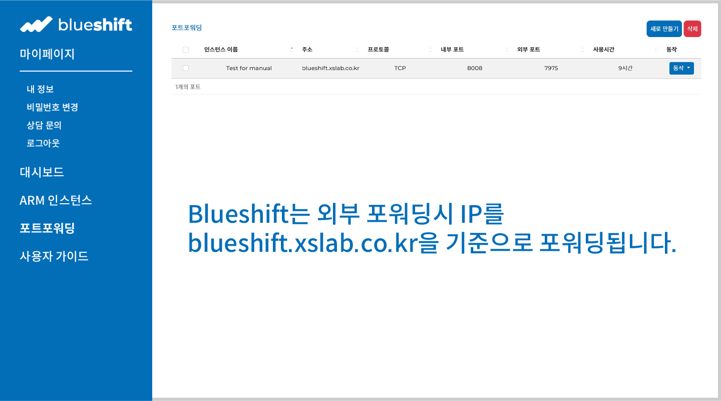 주소: pf.blueshift.xslab.co.kr, 포트: 생성된 외부 포트입니다.
